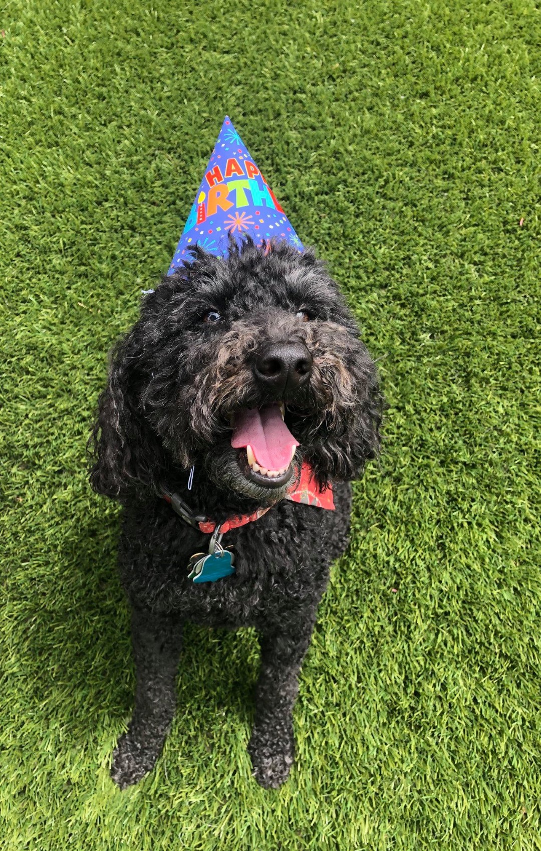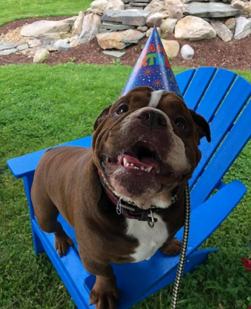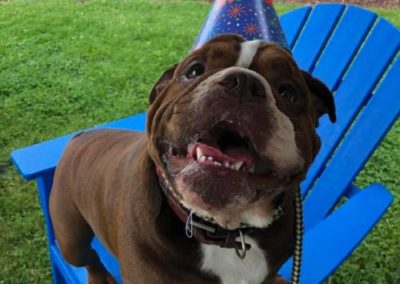 Dog with party hat at Good Mojo Dog Manor